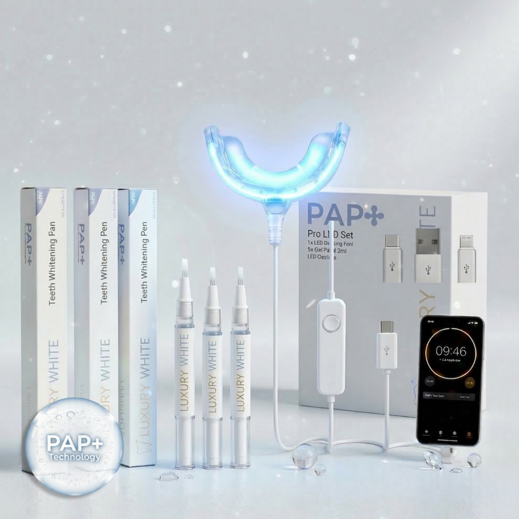 Luxury White biedt veilige, effectieve en betaalbare whitening-oplossingen voor thuis. Met de Pro-LED Tandenbleek Set haal je een professionele whitening-ervaring in huis. Kies voor kwaliteit, comfort en professionele resultaten – zonder tandartsbezoek.
